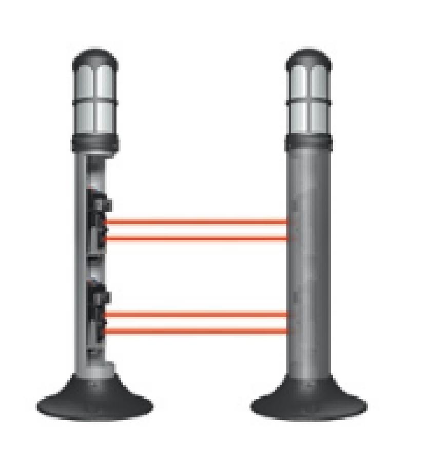 Carcasa tipo lámpara de guardia, donde de una forma sencilla se pueden ocultar detectores de doble rayo fotoeléctrico. Diseño discreto que se integra perfectamente en cualquier patio o jardín sin que éste pierda su valor estético.