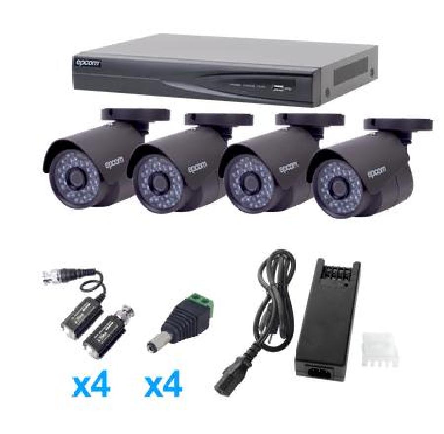 Incluye DVR 4 ch / 4 cámaras bala (interior - exterior, 2.8mm gran angular) / transceptores / conectores / fuente de poder profesional