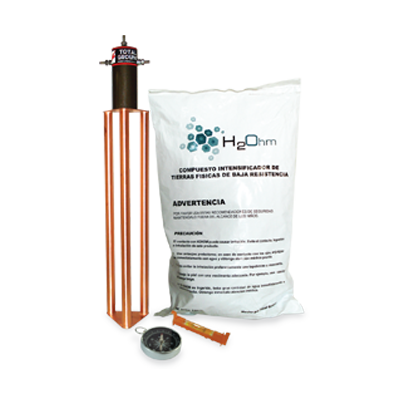 Electrodo:Electrodo de puesta a tierra marca TOTAL GROUND modelo TG-45AB. Elaborado de cobre electrolítico altamente conductivo, tratado especialmente para retardar los efectos de la corrosión. Incluye dispositivo de filtración de baja frecuencia LCR con bornes de acoplamiento a masa de 1/2 pulgada. Contiene acoplamiento en bobina para instalaciones residenciales o de baja actividad eléctrica.Compuesto H2Ohm: