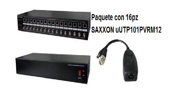 uUTP116PVSV36PAQ PAQUETE DE RECEPTOR PASIVO DE 16 CANALES DE VIDEO & 16 TRANSCEPTORES DE 1 CANAL SAXXON UTP116PVSV36 es balun dieciséis canales de vídeo, que permite la transmisión en tiempo real y de alto rendimiento de Video CCTV a color o monocromatico (B / W) y transmitision de energía a la cámara por cable UTP. Funciona con UTP101PV RM12 como transceptor de canal de video y regulación de la potencia del receptor con salida de 12 VDC. El receptor pasivo con alimentación UTP116PVSV36 permiten una comoda instalacion de videovigilancia utilizando solo cable UTP par trenzado. Utilizando transmisores pasivos UTP101PV-RM12 en cada canal, el receptor proporciona 36V de alimentacion a cada camara, encargandose el transmisor de bajar el voltaje que le llegue a 12V, de manera que no tengamos que preocuparnos nunca de distintos voltajes en largas tiradas de cable. Usando receptores y emisores UTP, podremos hacer una instalacion mucho mas rapida (no habra que regular voltajes), limpia (nos ahorraremos conexionados y transformadores, unico cable por camara), y directamente preparado para un cambio futuro a camaras IP.